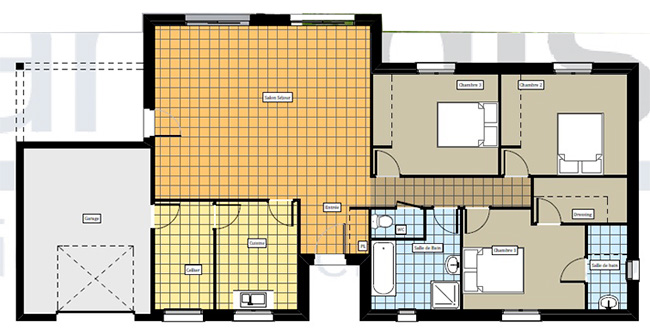 Joli modèle de plain-pied avec un espace jour bien séparé de la partie nuit. l'entrée donne sur un beau salon-séjour très lumineux grâce à ses grandes baies vitrées, la cuisine fermée s'ouvre sur un cellier qui donne accès au garage. la partie nuit est composée de 2 chambres, une salle de bains, wc indépendants ainsi qu'une suite parentale avec dressing et salle d'eau privée.