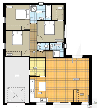 Modèle de plain-pied construit sur vide sanitaire 0,60, avec cuisine ouverte sur le salon-séjour de 36m2 , 4 chambres, salle de bain, wc, cellier et garage intégré. norme rt2012 cloisons placostil® chauffage gaz