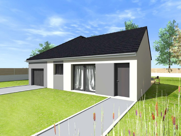 Modèle contemporain avec cuisine ouverte sur salon de 40m2, 3 chambres, salle de bains, cellier, wc, garage de 25m2 et terrasse.