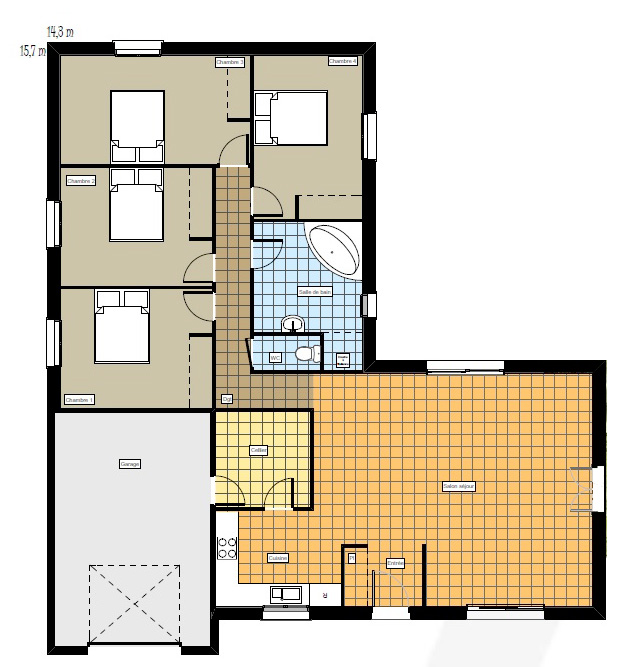 Modèle de maison plain-pied en l. entrée, cuisine ouverte sur salon-séjour, cellier, 4 chambres, salle de bains, wc, garage intégré