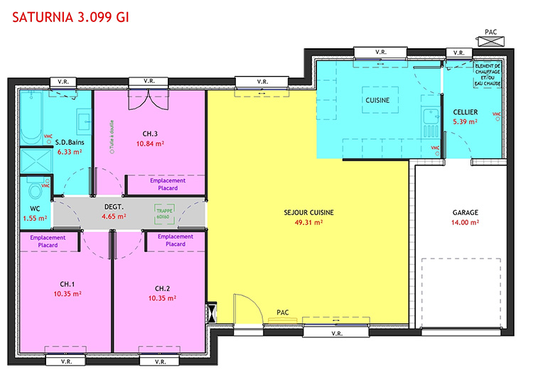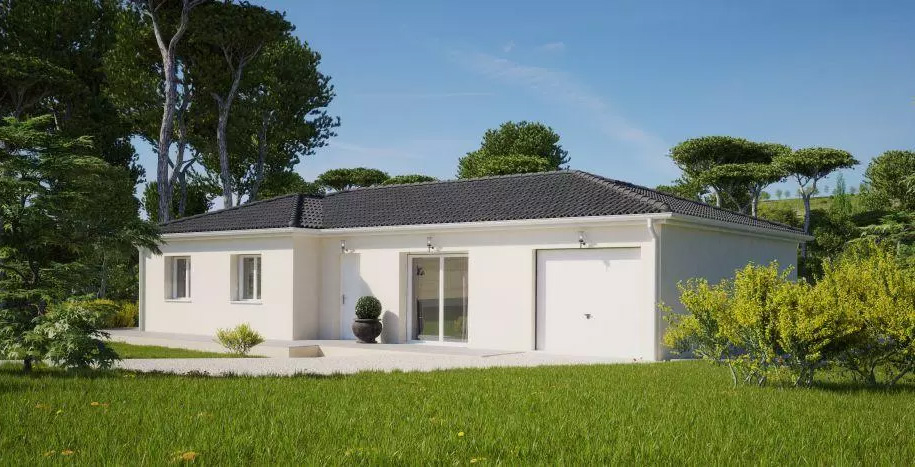 Maison de plain-pied de 99 m² avec garage intégré, comprenant une grande pièce à vivre lumineuse de 49 m², dédiée à la cuisine, au séjour et à la salle à manger, 3 chambres, une salle de bains équipée, un wc et un cellier avec accès direct au garage. maison basse consommation à haute isolation thermo-acoustique, équipée d'un système d'alarme et de télésurveillance, de détecteurs de fumée, une box domotique avec gestionnaire d'énergie, chauffa
