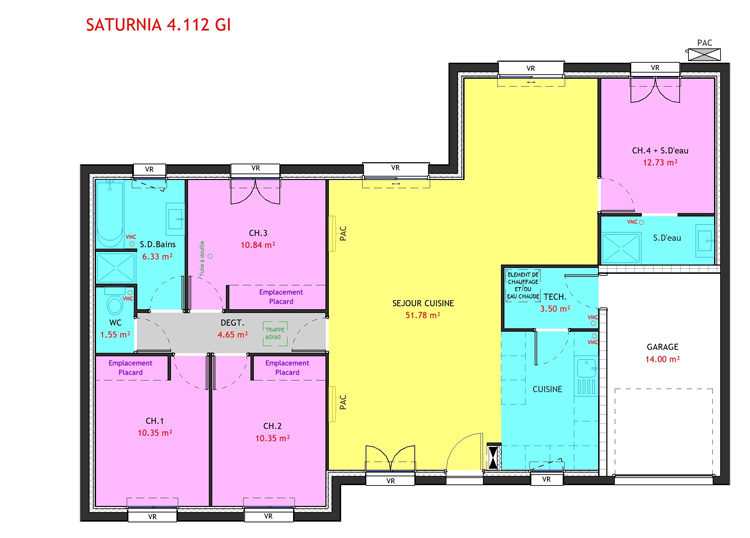Maison de plain-pied de 112 m² avec garage intégré, comprenant une grande pièce à vivre lumineuse de 52 m², dédiée à la cuisine, au séjour et à la salle à manger, 4 chambres, dont une avec salle d'eau privative, une salle de bains équipée, un wc et un cellier avec accès direct au garage. maison basse consommation à haute isolation thermo-acoustique, équipée d'un système d'alarme et de télésurveillance, de détecteurs de fumée, une box domotiqu