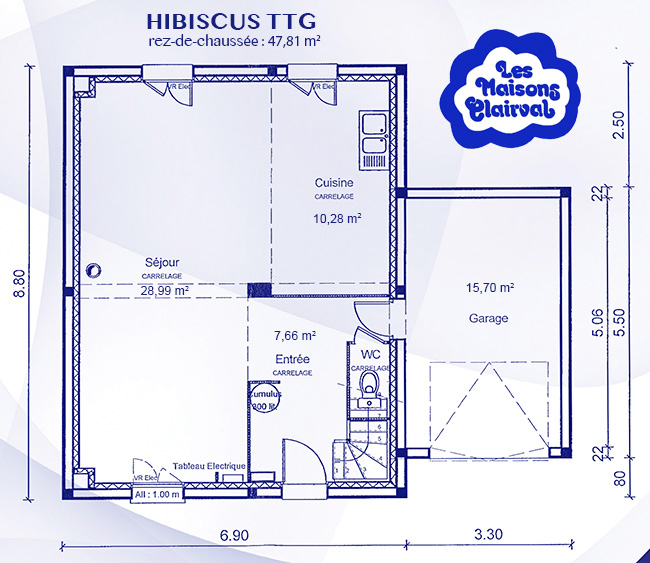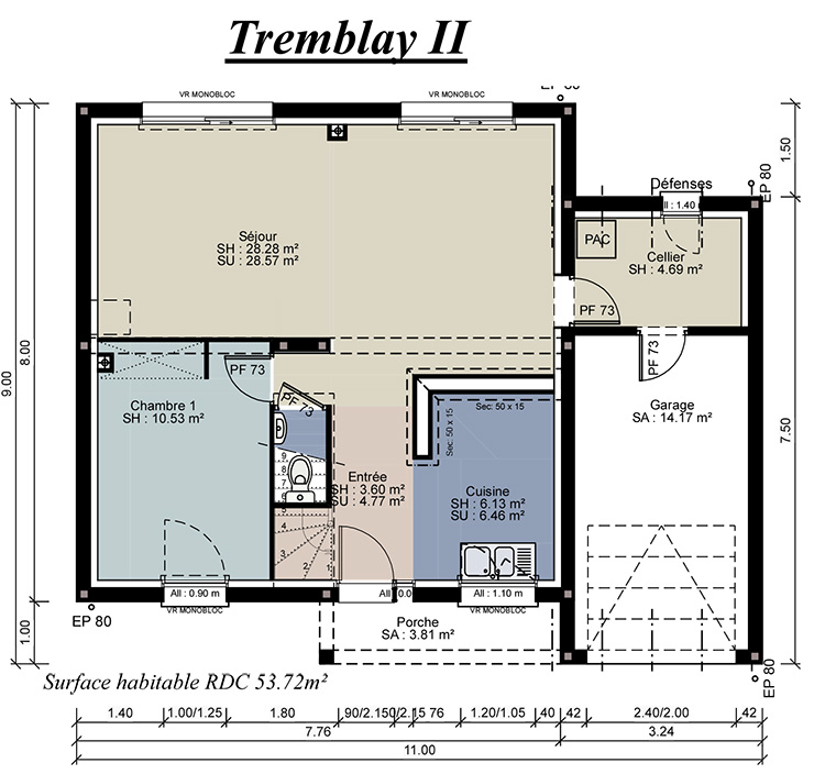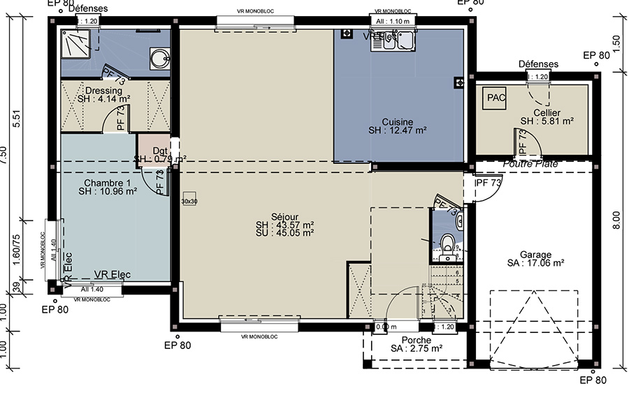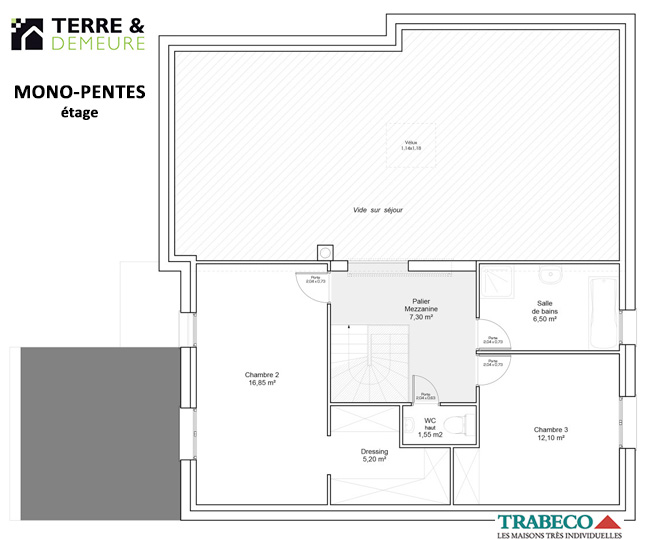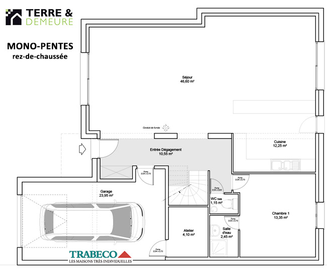 Modèle de la gamme terre & demeure trabeco aux formes ultra modernes, baigné de lumière naturelle grâce à ses nombreuses ouvertures et baies vitrées. le volume intérieur est généreux avec une hauteur sous plafond type cathédrale pouvant atteindre 4 m. retrouvez au rez-de-chaussée ; une entrée avec penderie, un grand séjour de 46 m2, une cuisine ouverte sur le séjour, un cellier, une chambre avec salle d’eau, wc, grand garage, local techniqu