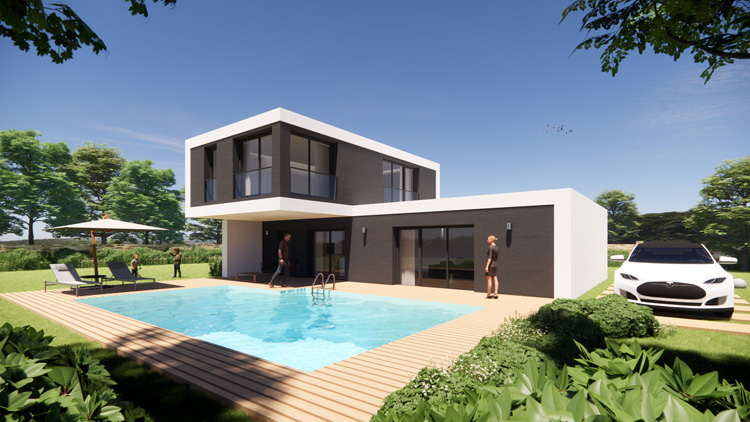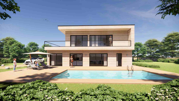 Modèle de 150m² avec de grandes baies vitrées proposé en 4 à 6 chambres, 2 à 4 salles de bains, en version toit plat (toiture végétalisée, toit terrasse béton ou bac acier), 4 pans ou 2 pans. maison haut de gamme à prix compétitifs avec de très belles prestations : maison re 2020, corniche béton, gouttière aluminium 7016, enduit gratté, mur en brique haute performance, cloison acoustique avec laine minérale, portes intérieurs aspect bois aux c