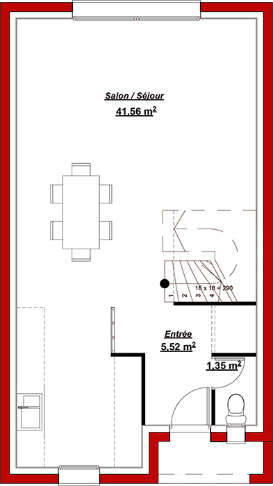 Modèle spécialement conçue pour s'adapter sur les terrains à très petite façade. malgré sa faible façade, cette maison offre tout de même une surface habitable de 92 m² répartie sur 2 niveaux. le rez-de-chaussée est consacré aux pièces de vie avec un séjour/salon de plus de 41 m² et des toilettes indépendantes. l'étage vous propose 3 chambres dont une suite parentale, une salle de bains et des toilettes indépendantes. son porche d'ent