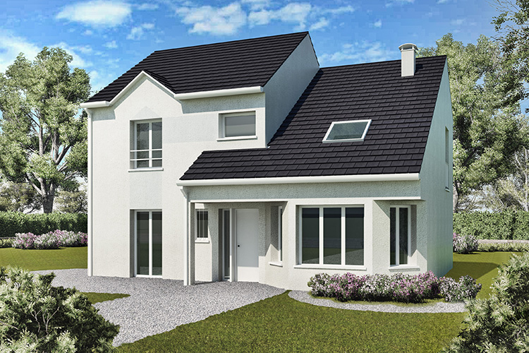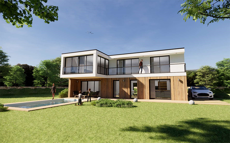 Modèle de 150m² avec de grandes baies vitrées proposé en 4 à 6 chambres, 2 à 4 salles de bains, en version toit plat (toiture végétalisée, toit terrasse béton ou bac acier), 4 pans ou 2 pans. maison haut de gamme à prix compétitifs avec de très belles prestations : maison re 2020, corniche béton, gouttière aluminium 7016, enduit gratté, mur en brique haute performance, cloison acoustique avec laine minérale, portes intérieurs aspect bois aux c