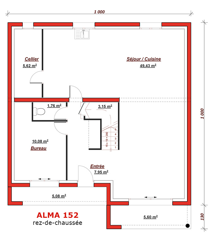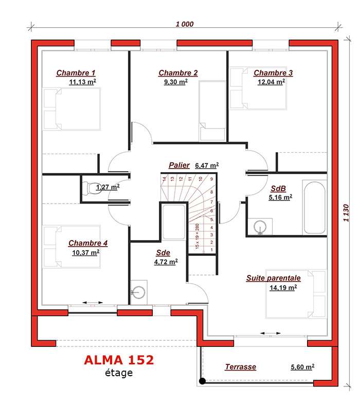 Inspirée des plus belles références de l'architecture moderne, l' alma 152 se différencie des autres maisons grâce à ses volumes cubiques, son jeu d'enduits, ses grandes baies vitrées et sa terrasse réservée à la suite parentale. l'alma 152 vous offre au rez-de-chaussée un espace salon/séjour et cuisine ouverte de plus de 45m², un bureau ainsi qu'un cellier et une vaste entrée avec placard. a l'étage, une mezzanine dessert 4 chambres ainsi qu'