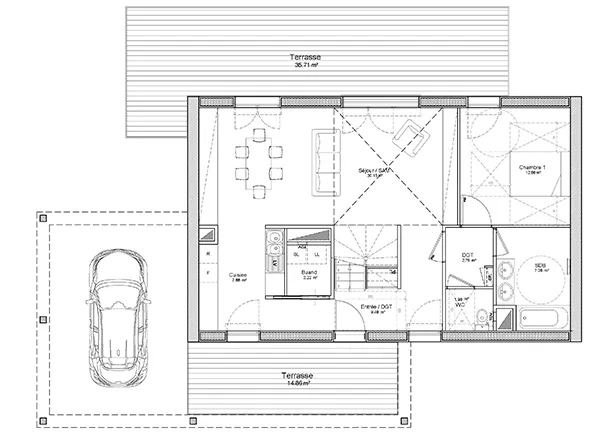 Elle bénéficie d'une cuisine ouverte sur salon-séjour de 38m2, wc, garage à l'étage, 3 chambres, 1 salle de bain, wc. ce modèle se décline en versions 3 chambres ou 4 chambres dont 1 grande suite parentale.
