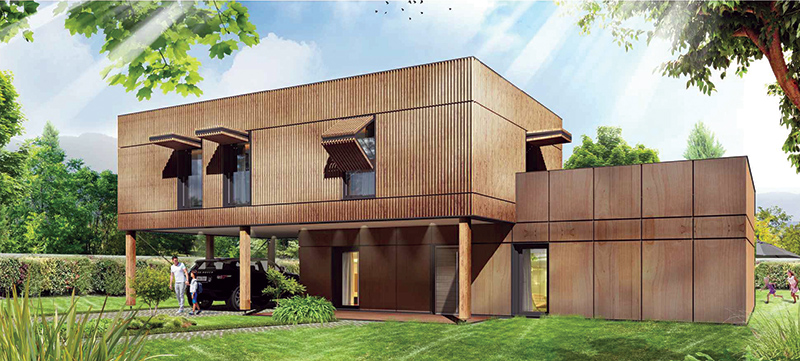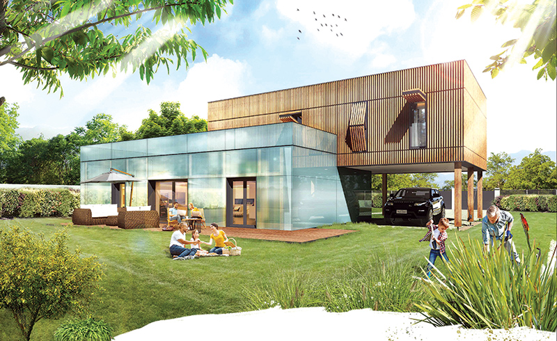 Maison familiale à toit plat proposée en 2 versions (plexiglas ou bois) le rez-de-chaussée est composé d'une entrée, des pièces de vie et d'une chambre avec salle de bains, une terrasse et un garage. à l'étage, 3 chambres dont une suite parentale, 2 salles de bains, wc